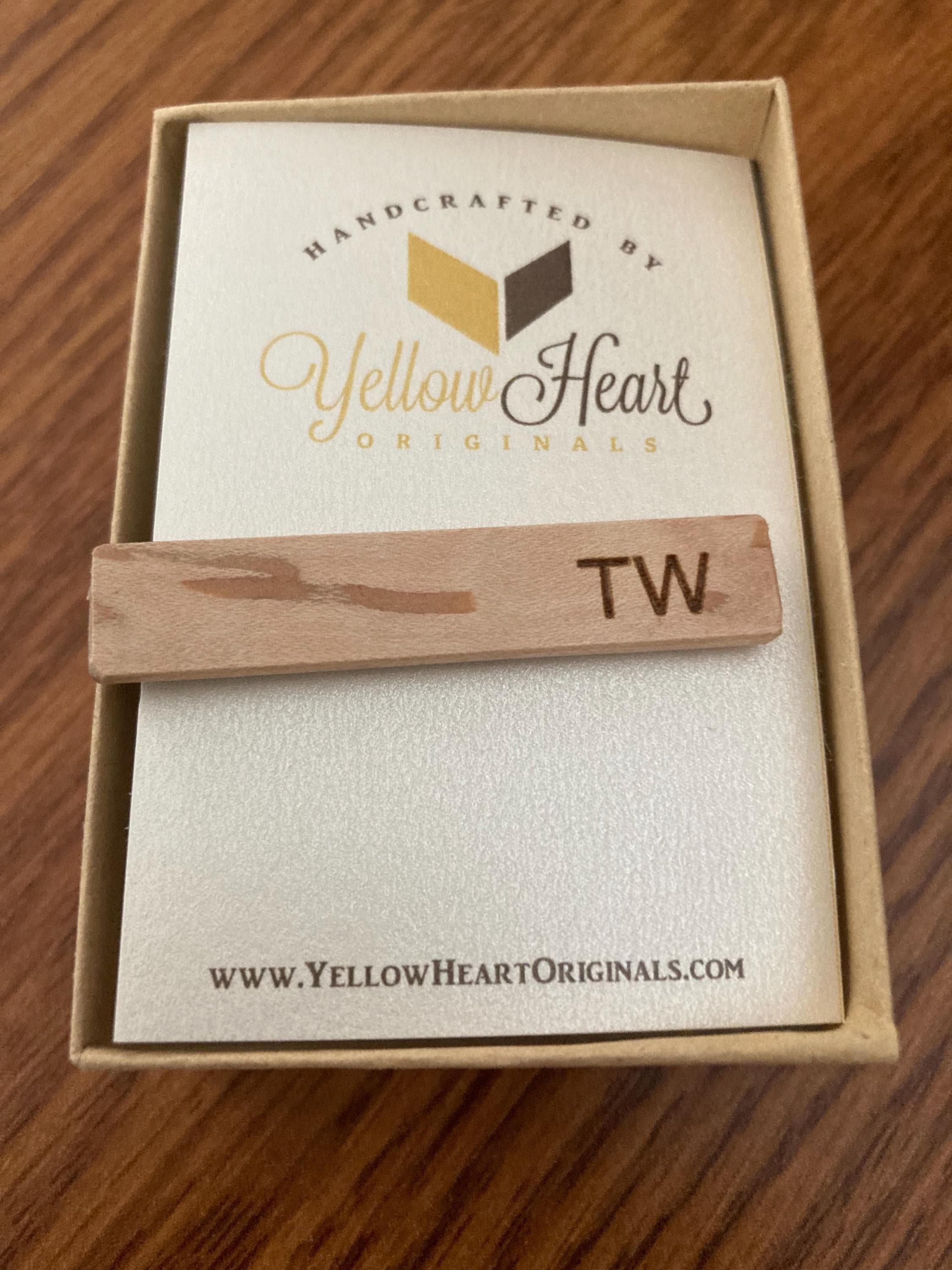 These tie clips come in a pack of 4, with the option of additional clips. The tie clips are 2” x 3/8” and are made from various hardwoods attached to a metal clip. These are awesome groom or groomsmen gifts!